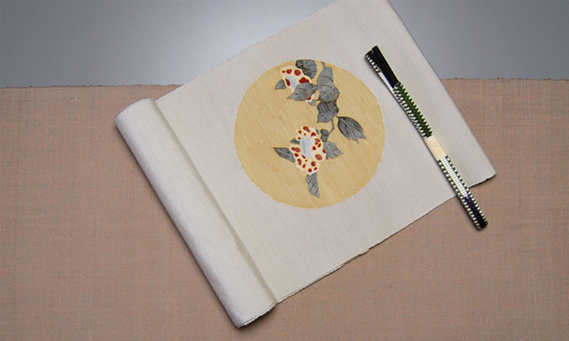 | 真綿紬・すくい八寸帯「円取椿」 |