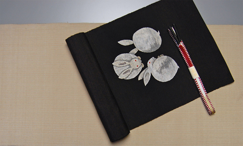 | 座繰り紬・すくい八寸帯「三つ兎」 |